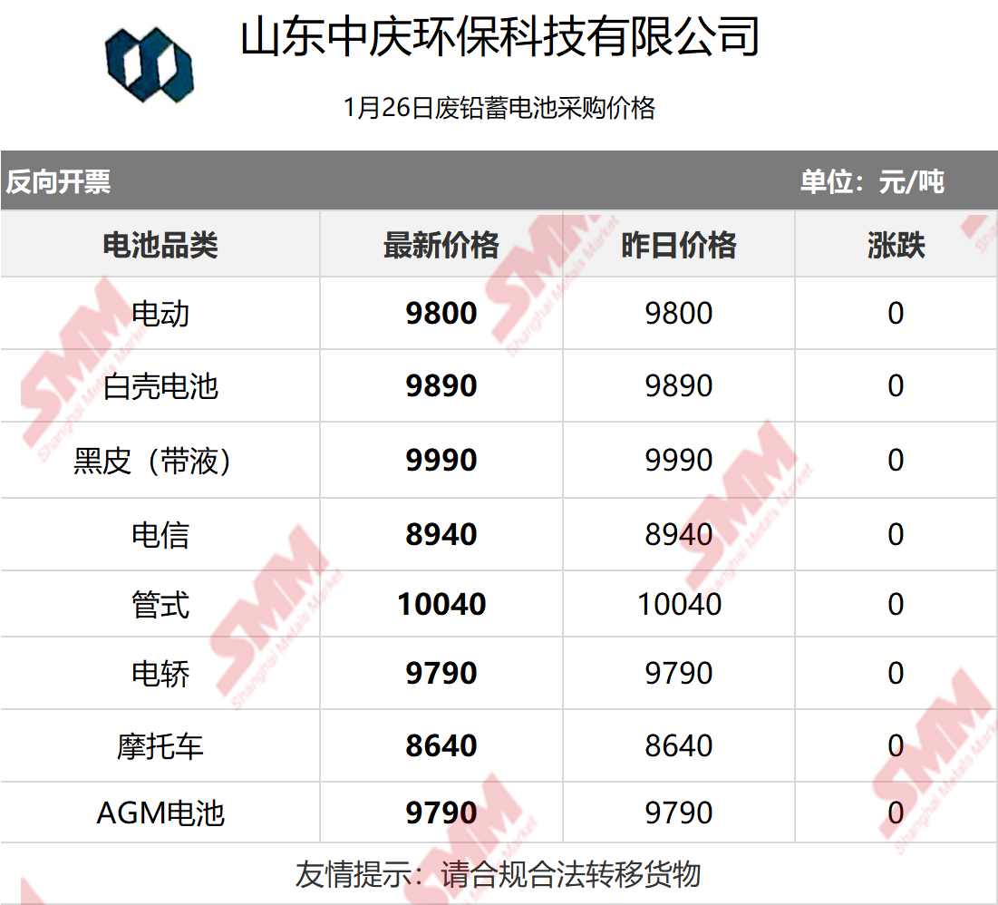 1月26日山东中庆 废电瓶采购报价