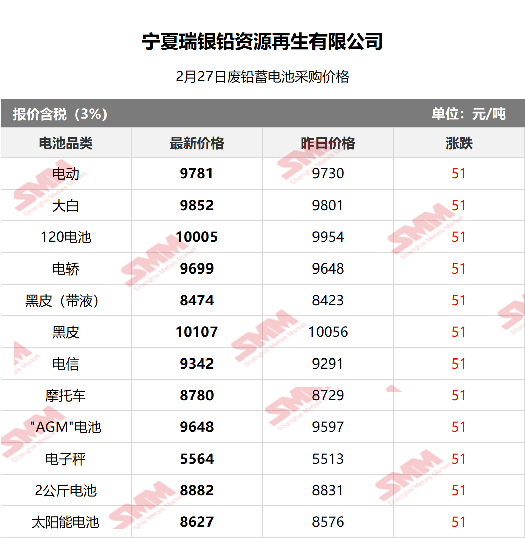 SMM 2026/2/27 国内知名再生铅企业废电瓶采购报价