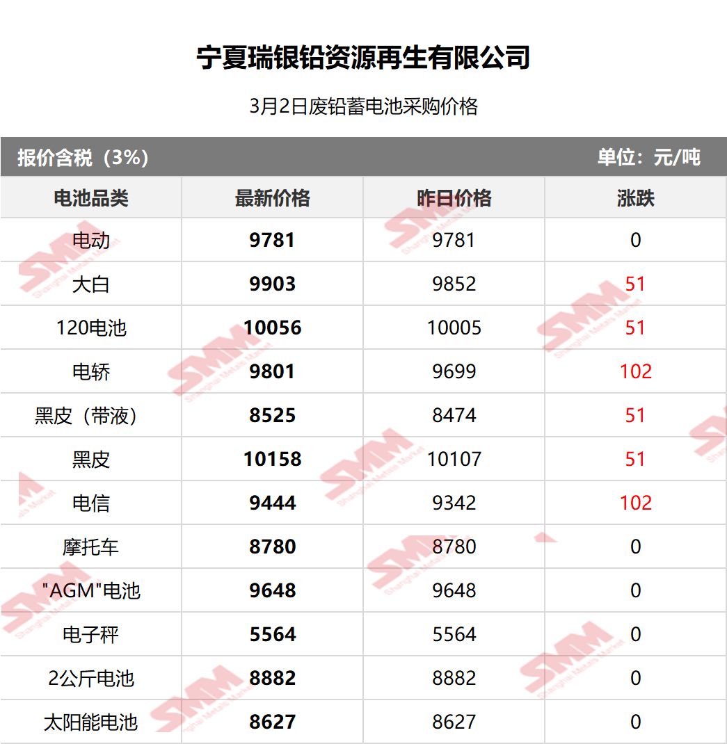 3月2日宁夏瑞银 废电瓶采购报价