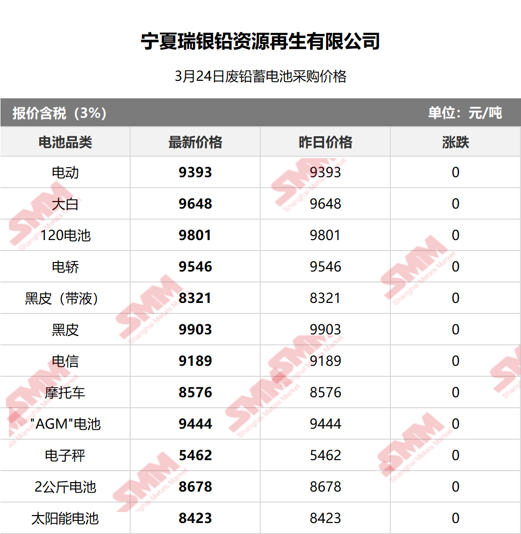 SMM 2026/3/24 国内知名再生铅企业废电瓶采购报价