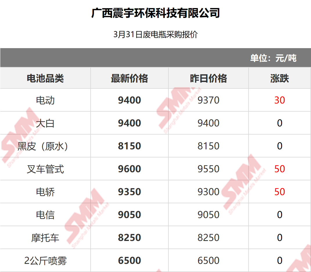 3月31日广西震宇 废电瓶采购报价
