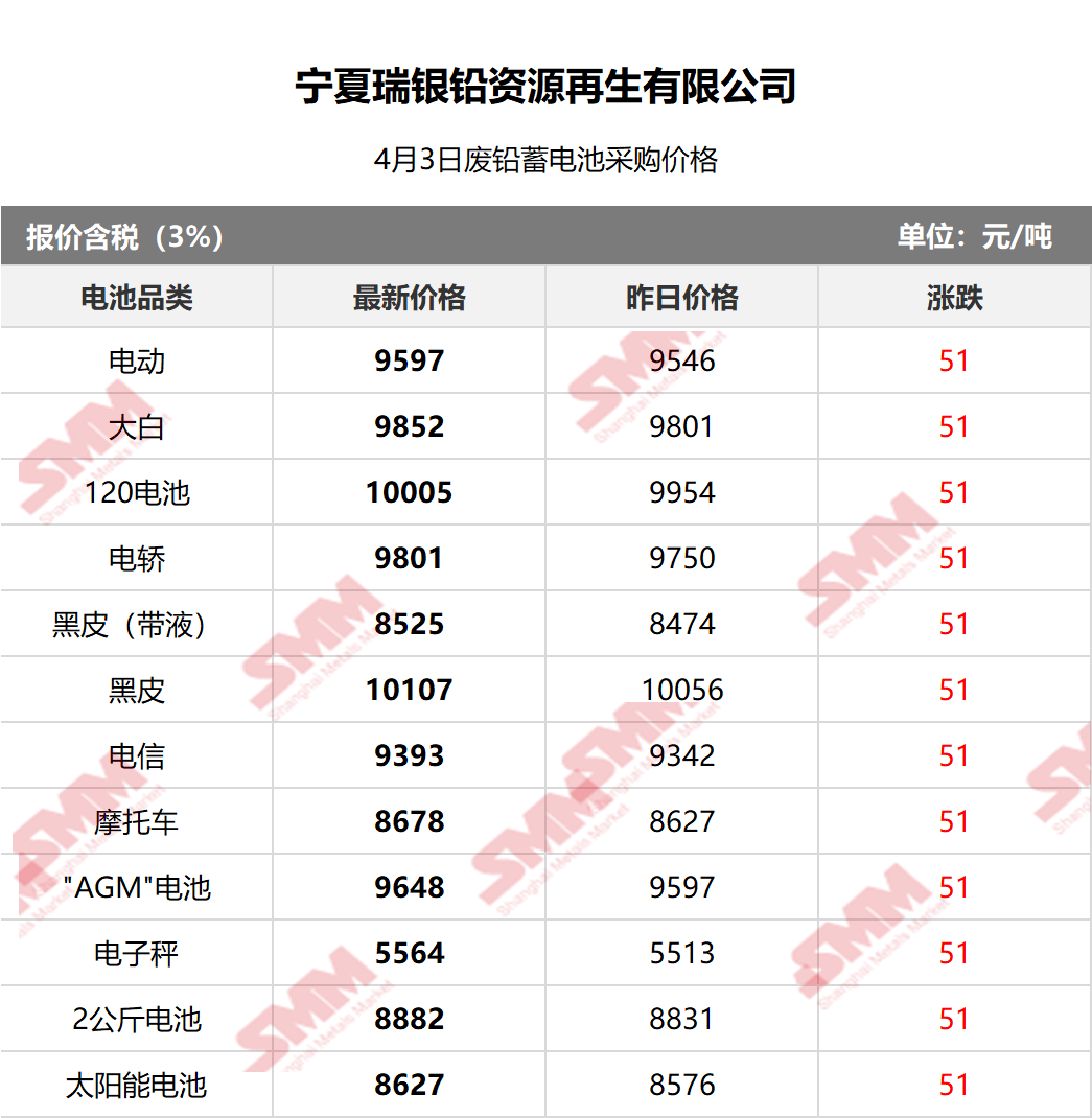 SMM 2026/4/3 国内知名再生铅企业废电瓶采购报价