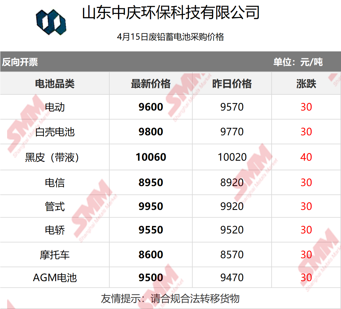 SMM 2026/4/15 国内知名再生铅企业废电瓶采购报价
