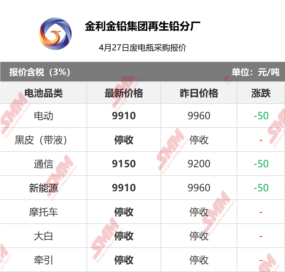 SMM 2026/4/24 国内知名再生铅企业废电瓶采购报价