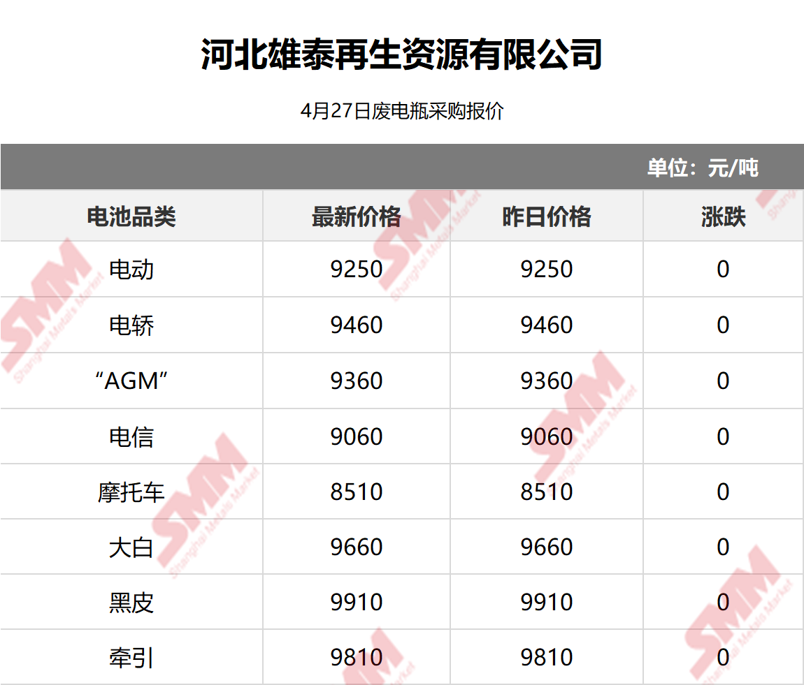 4月27日河北雄泰 废电瓶采购报价