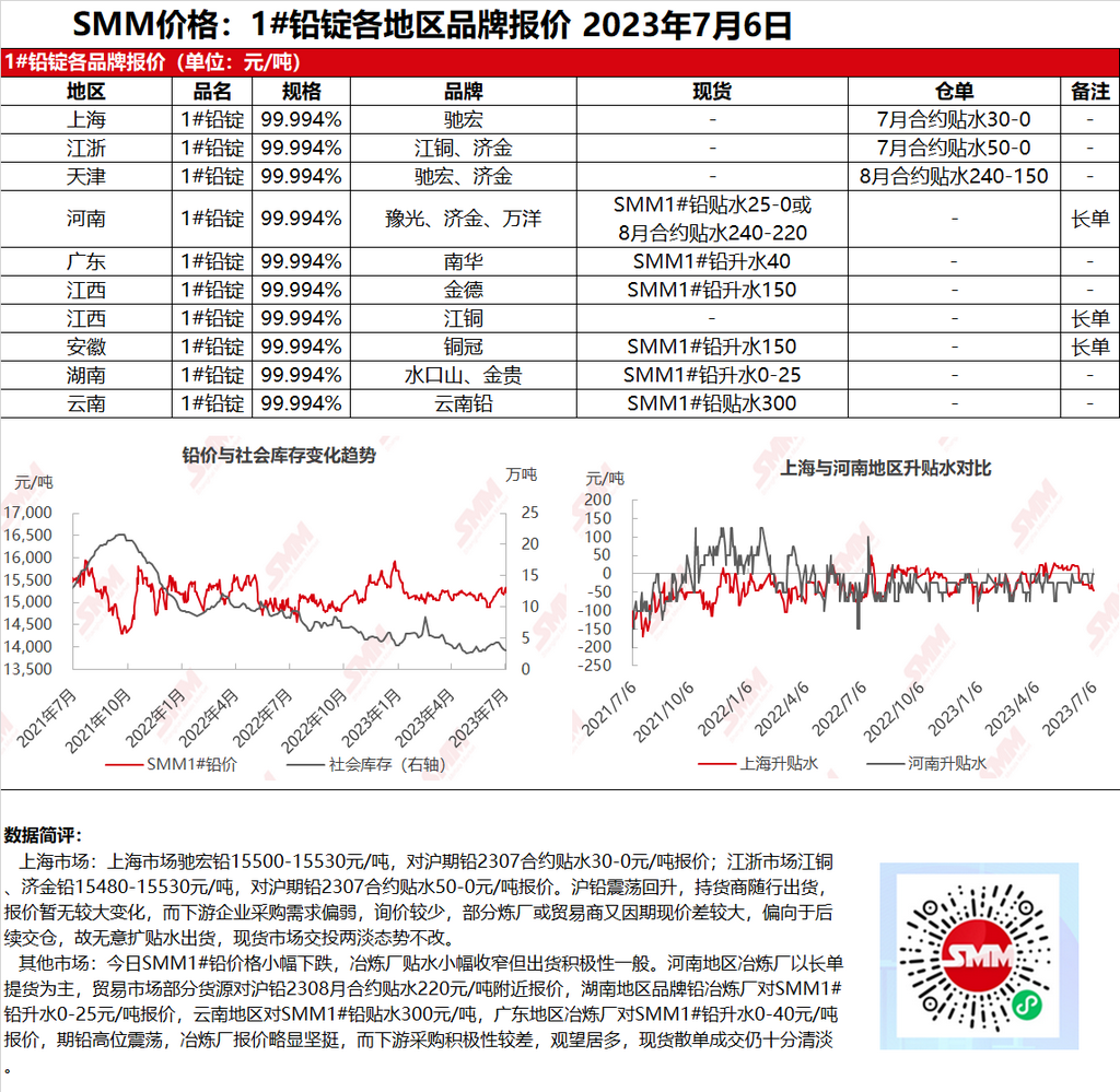 【SMM 上海及其他1#铅市场午评:沪铅震荡回升 而现货市场交投两淡态势不改】 SMM7月6日讯:上海市场驰宏铅15500-15530元/吨,对沪期铅2307合约贴水30-0元/吨报价;江浙市场江铜、济金铅15480-15530元/吨,对沪期铅2307合约贴水50-0元/吨报价。沪铅震荡回升,持货商随行出货,报价暂无较大变化,而下游企业采购需求偏弱......