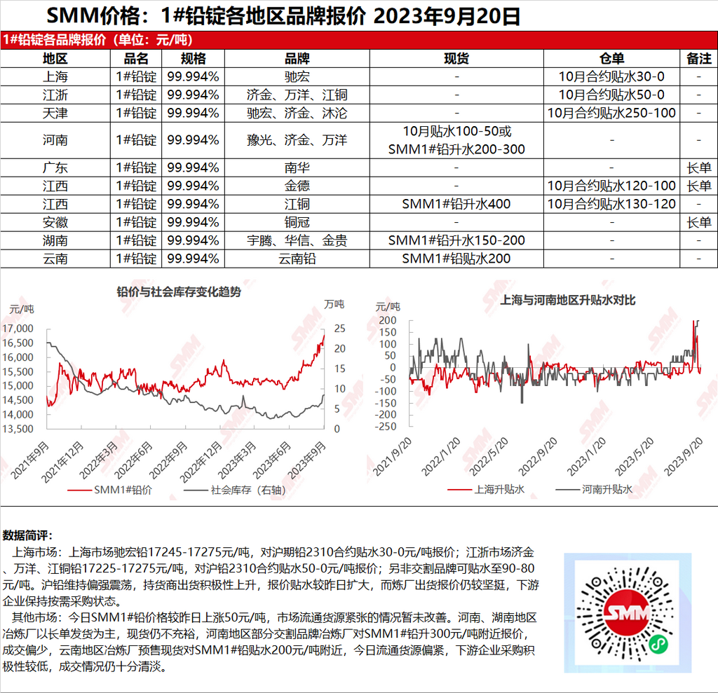 【SMM 上海及其他1#铅市场午评:沪铅持续走强 贸易市场现货贴水扩大】 SMM9月20日讯:上海市场驰宏铅17245-17275元/吨,对沪期铅2310合约贴水30-0元/吨报价;江浙市场济金、万洋、江铜铅17225-17275元/吨,对沪铅2310合约贴水50-0元/吨报价;另非交割品牌可贴水至90-80元/吨。沪铅维持偏强震荡,持货商出货积极性上升,报价贴水较昨日扩大......