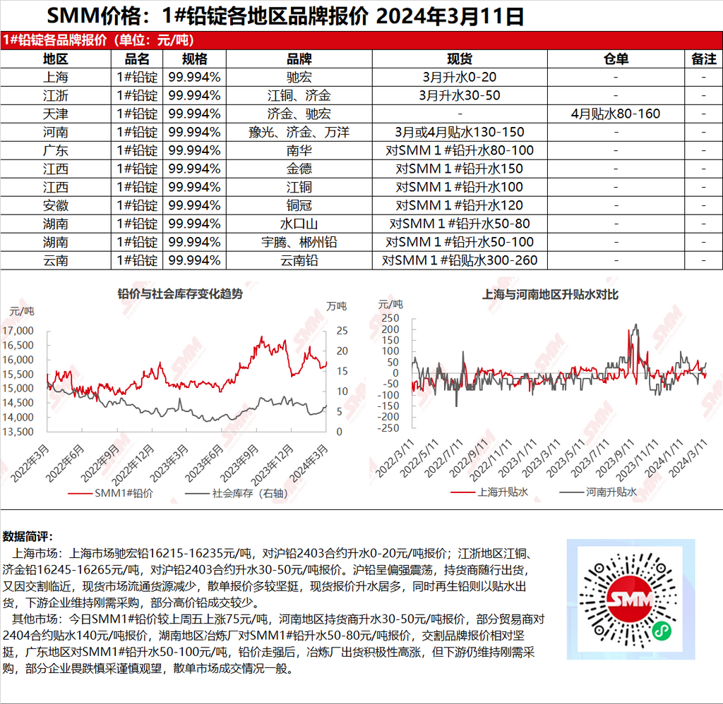 【SMM 上海及其他1#铅市场午评:沪铅呈偏强震荡 现货市场偏向升水出货】SMM3月11日讯:上海市场驰宏铅16215-16235元/吨,对沪铅2403合约升水0-20元/吨报价;江浙地区江铜、济金铅16245-16265元/吨,对沪铅2403合约升水30-50元/吨报价。沪铅呈偏强震荡,持货商随行出货,又因交割临近,现货市场流通货源减少......