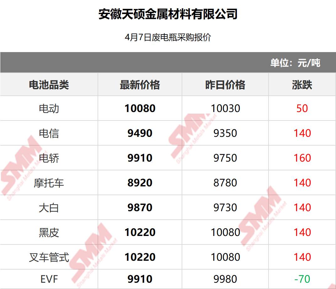 4月7日安徽天硕 废电瓶采购报价