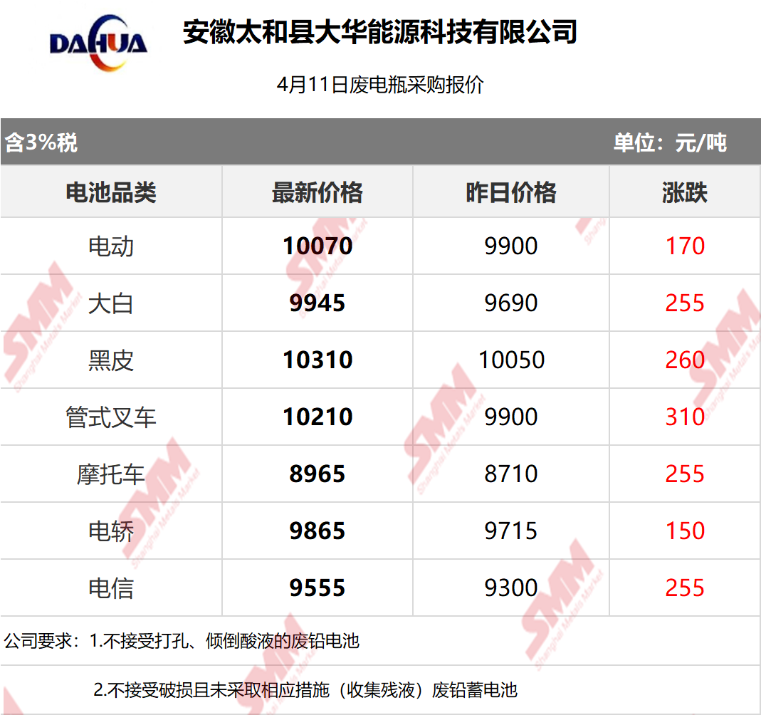 4月11日安徽大华 废电瓶采购报价