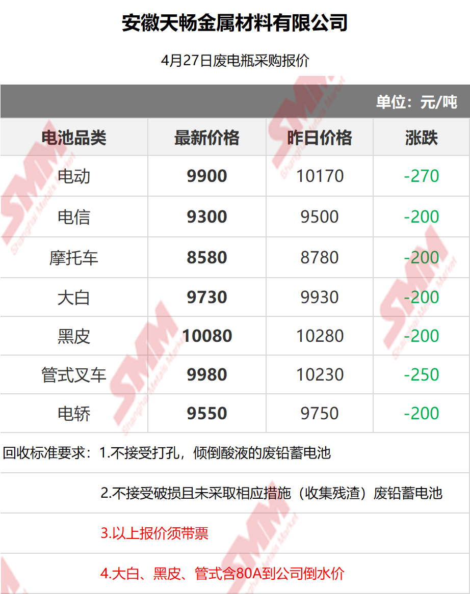4月27日安徽天畅 废电瓶采购报价