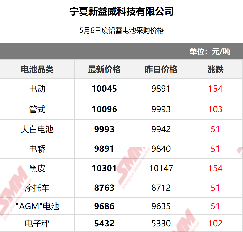 5月6日宁夏新益威 废电瓶采购报价