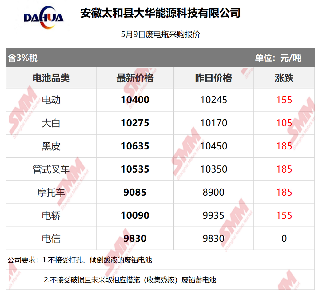 5月9日安徽大华 废电瓶采购报价