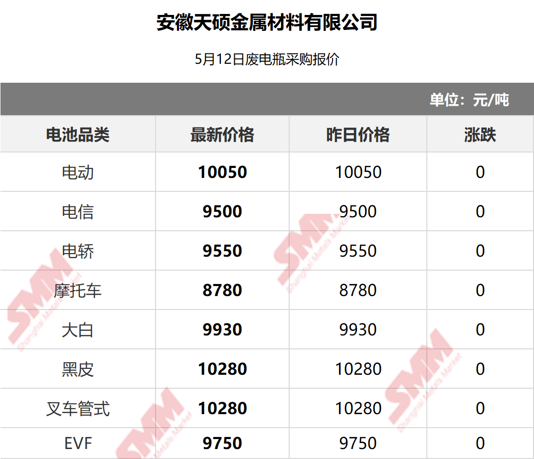 5月12日安徽天硕 废电瓶采购报价