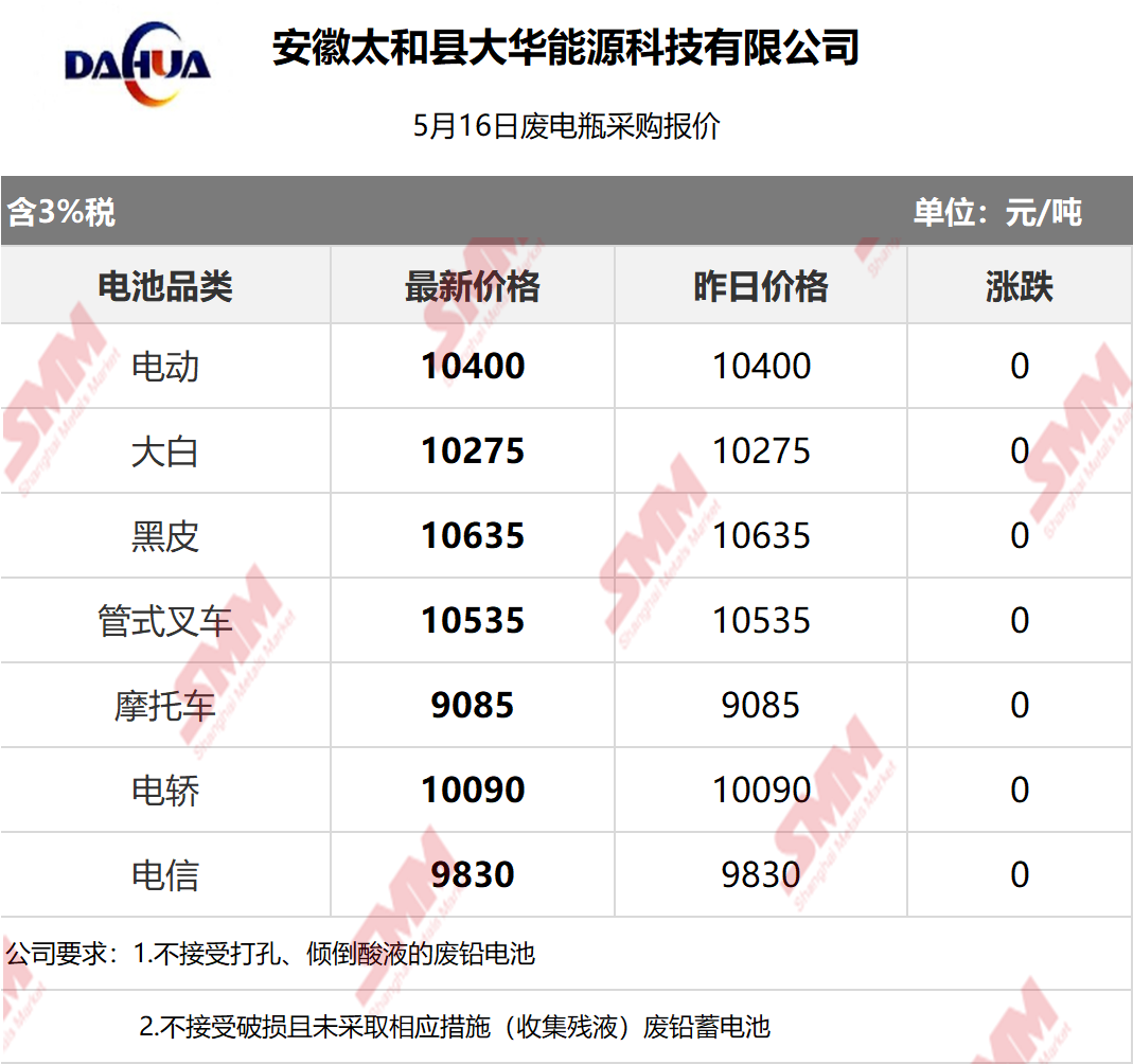 5月16日安徽大华 废电瓶采购报价