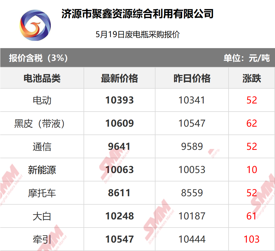 5月19日济源聚鑫 废电瓶采购报价