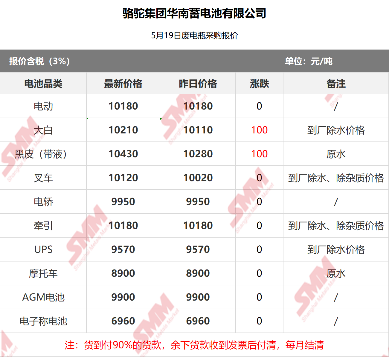 5月19日骆驼华南 废电瓶采购报价