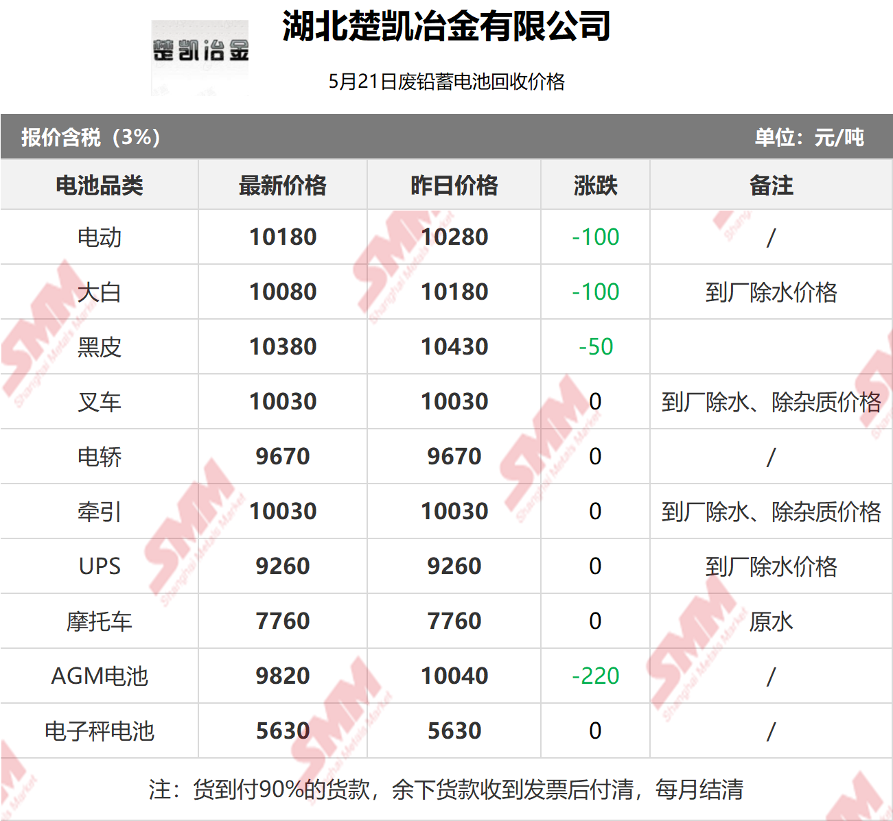 5月21日湖北楚凯 废电瓶采购报价