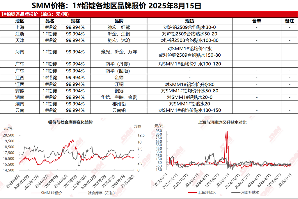 【SMM 上海及其他1#铅市场:铅价走势偏弱 现货市场成交相对清淡】 SMM8月15日讯:上海市场驰宏、红鹭铅16750-16795元/吨,对沪铅2509合约贴水30-0元/吨;江浙市场济金、江铜铅16750-16775元/吨,对沪铅2509合约贴水30-20元/吨报价。沪铅运行重心逐步下移,持货商报价随行就市......