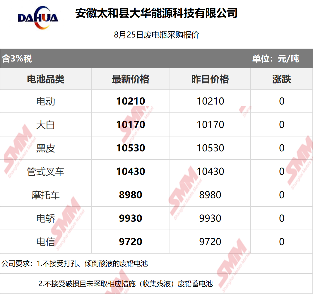 8月25日安徽大华 废电瓶采购报价