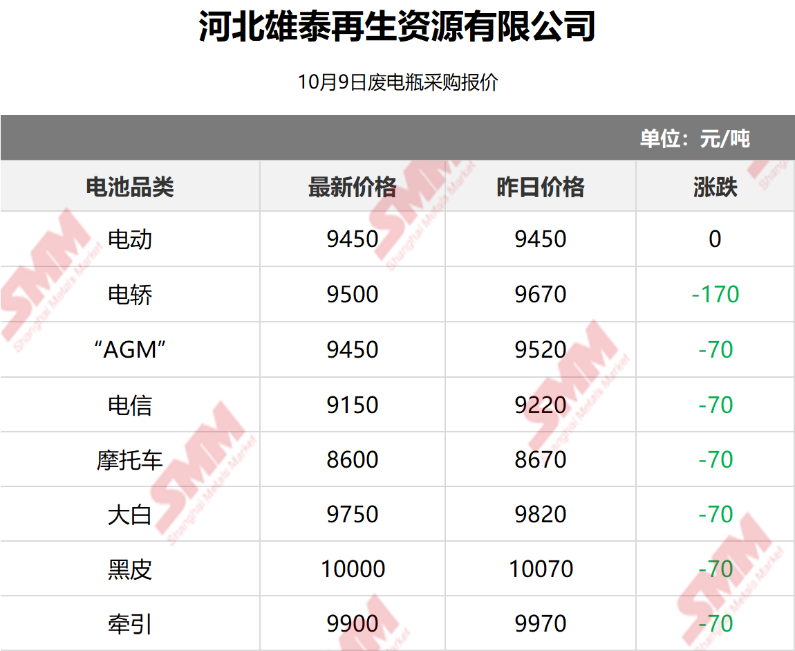10月9日河北雄泰 废电瓶采购报价