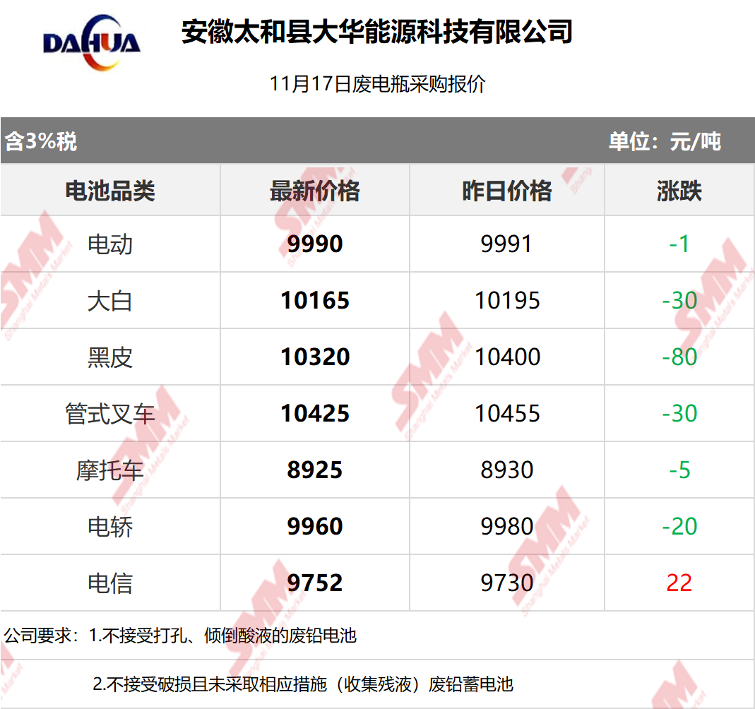 11月17日安徽大华 废电瓶采购报价