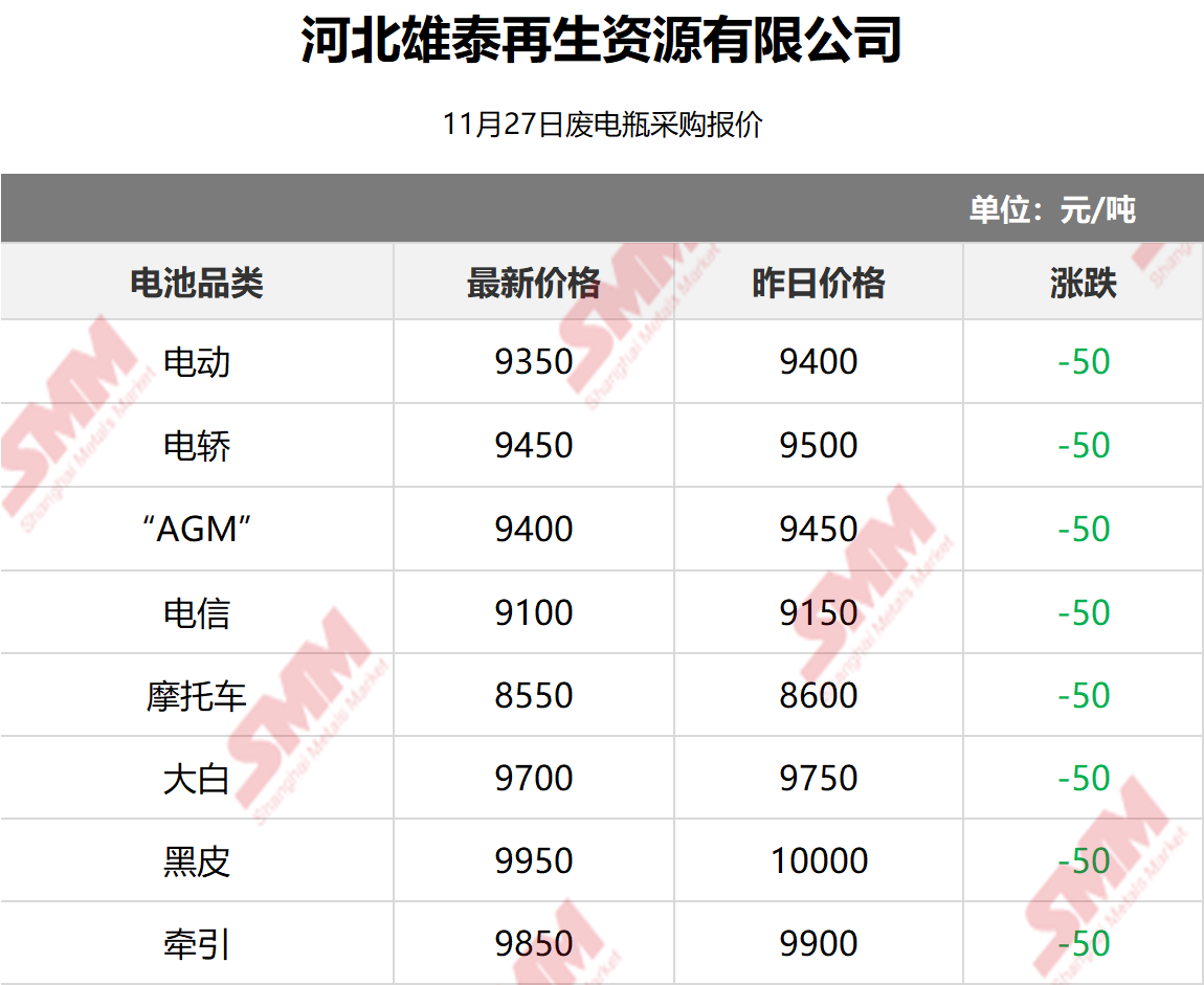 11月27日河北雄泰 废电瓶采购报价