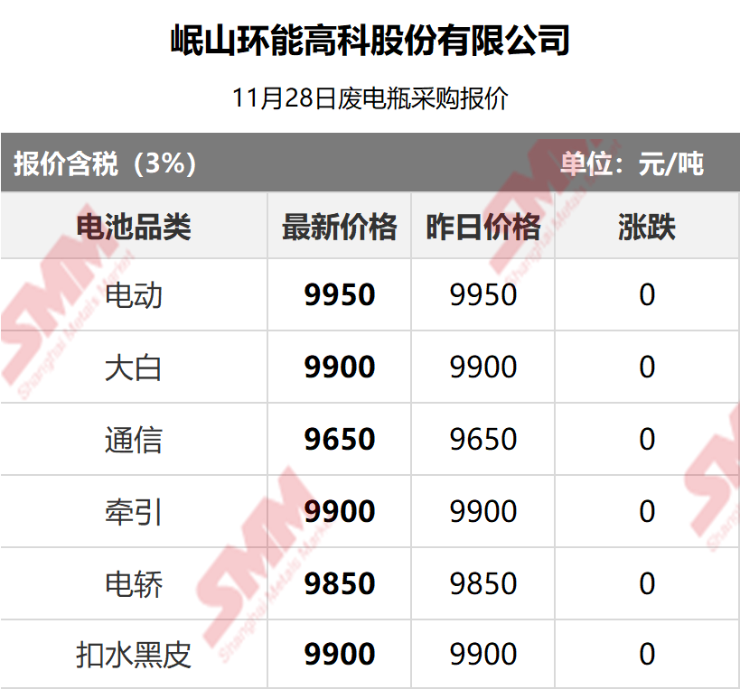 11月28日岷山环能 废电瓶采购报价