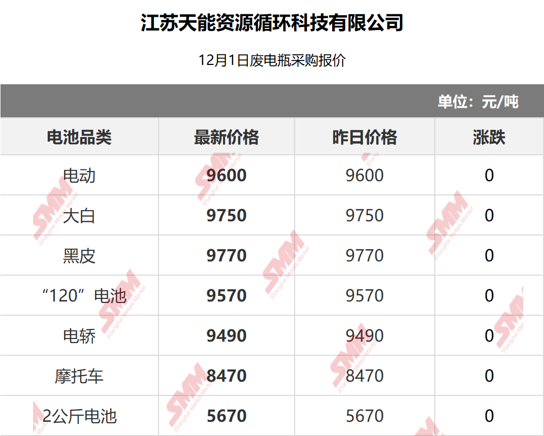 SMM 2025/12/8 国内知名再生铅企业废电瓶采购报价