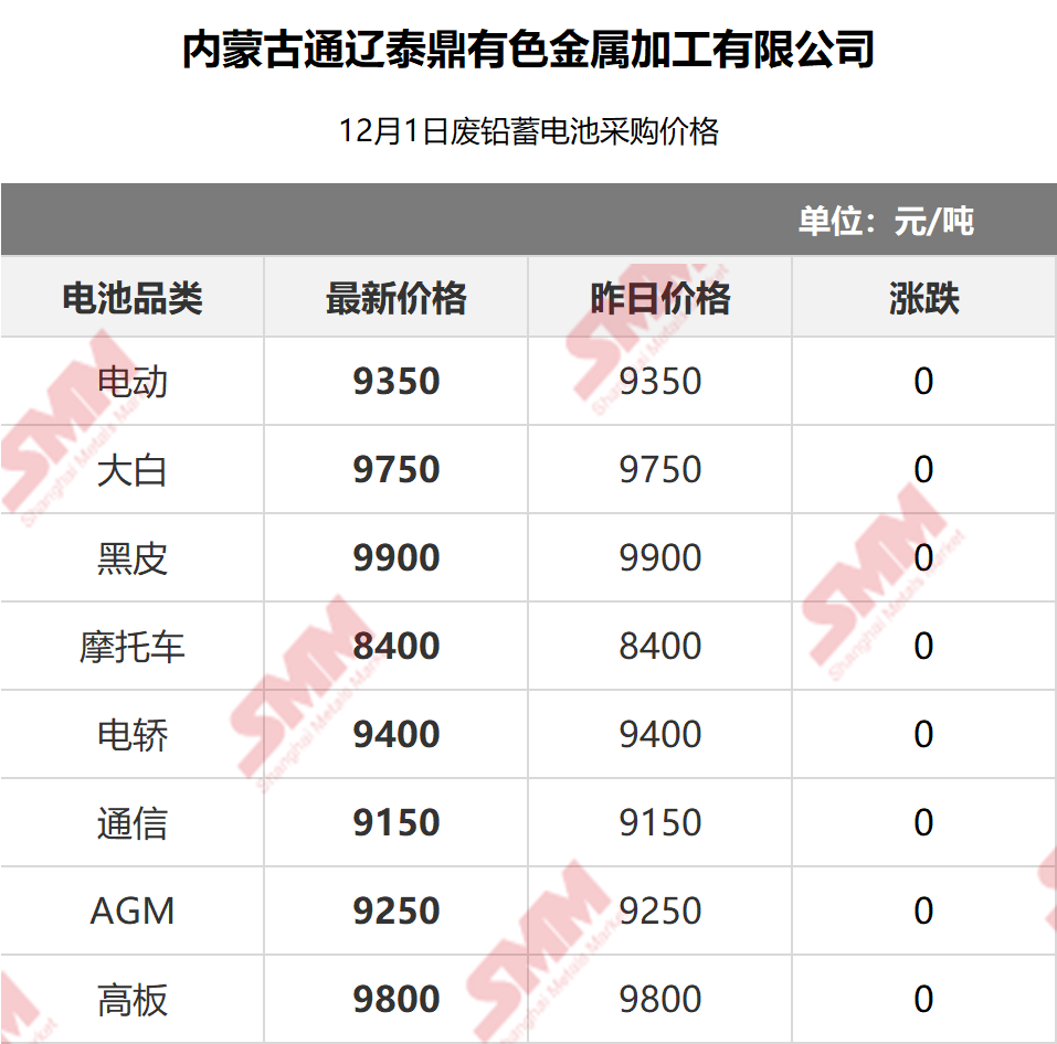 SMM 2025/12/9 国内知名再生铅企业废电瓶采购报价