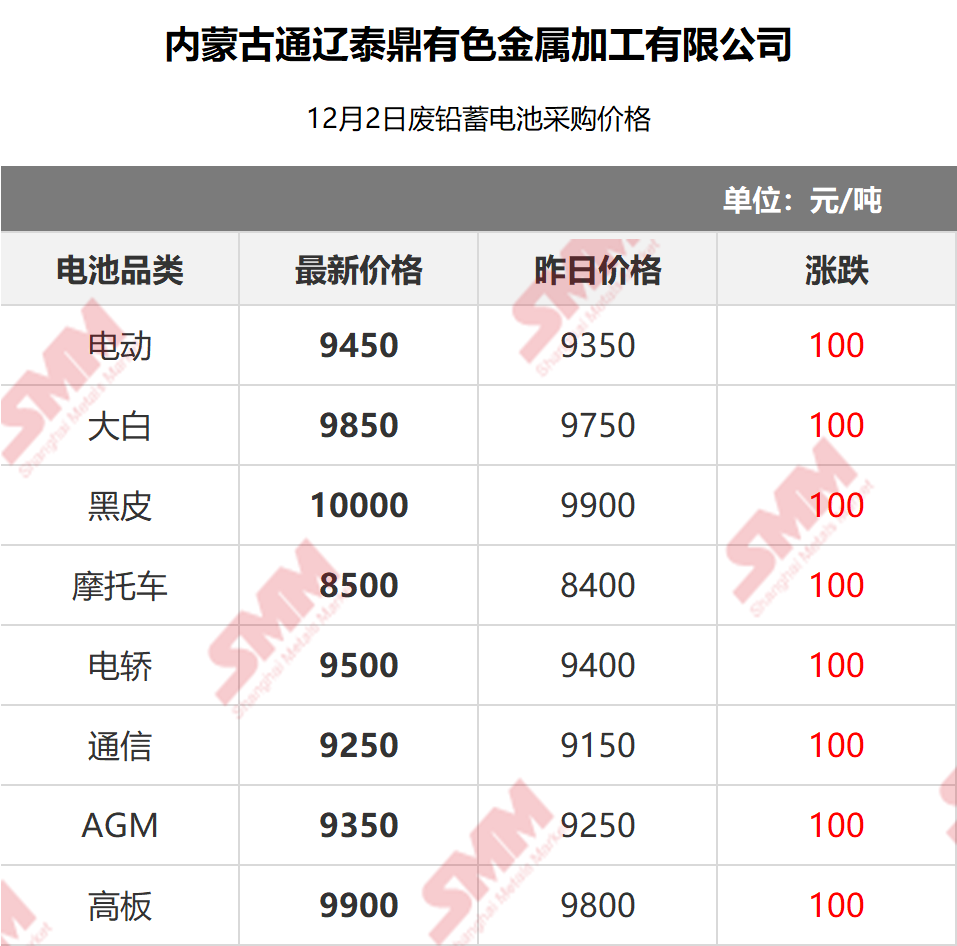 SMM 2025/12/8 国内知名再生铅企业废电瓶采购报价