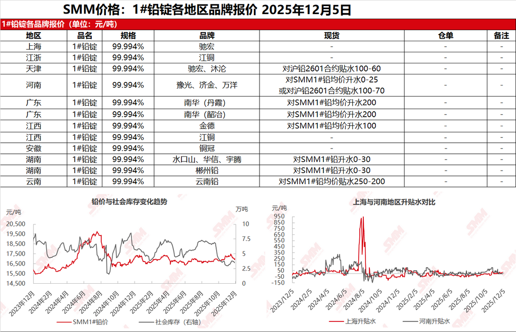 【SMM 上海及其他1#铅市场:铅价呈偏强震荡 现货市场交易活跃度下降】 SMM12月5日讯:江浙沪市场铅现货流通货源有限,持货商报价较少,个别仓单货以升水报价(对沪铅2601合约),另其他多数货源为炼厂厂提铅锭......