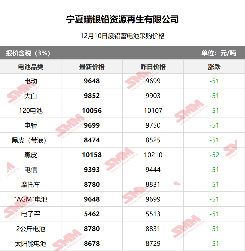 SMM 2026/3/10 国内知名再生铅企业废电瓶采购报价