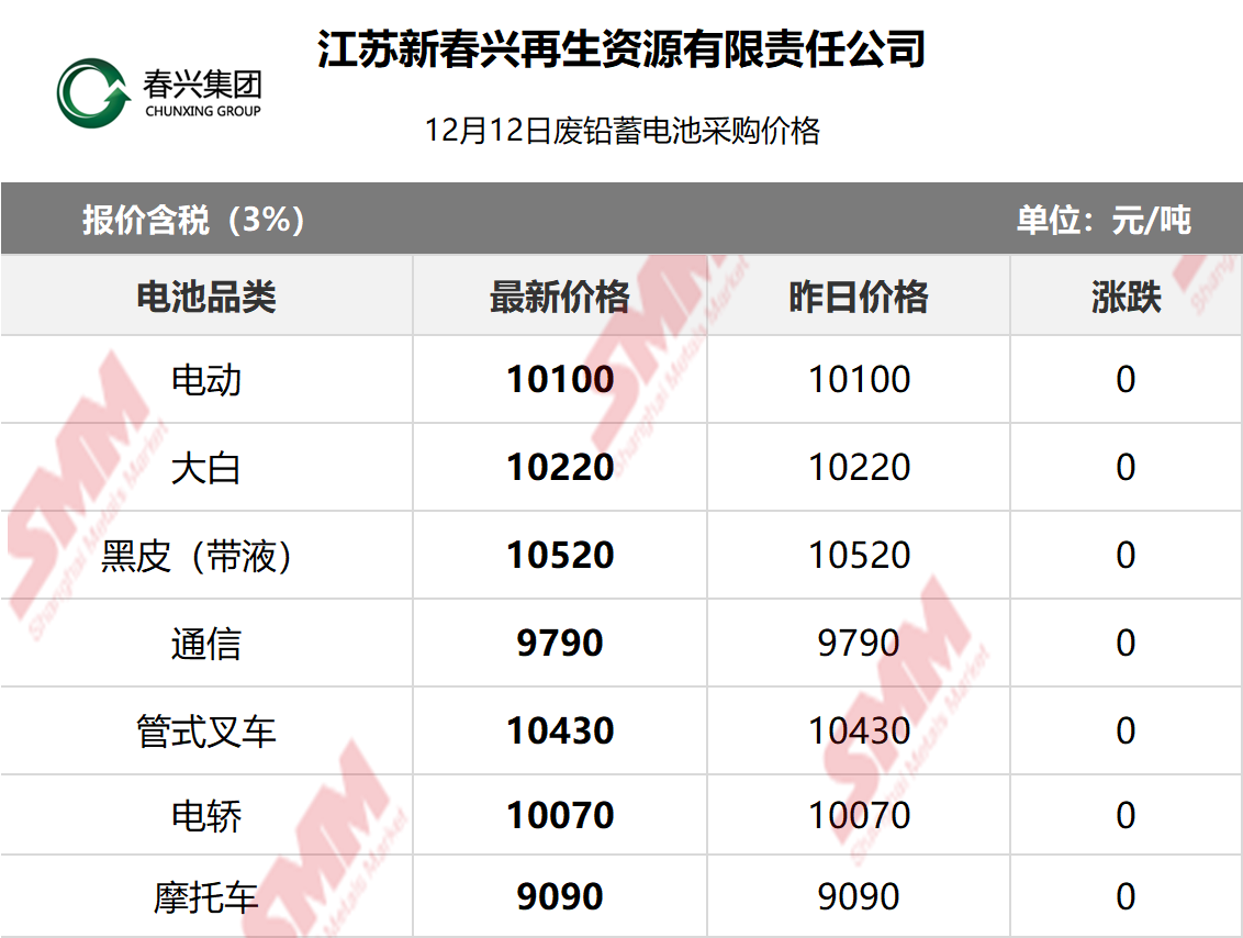 SMM 2025/12/12 国内知名再生铅企业废电瓶采购报价