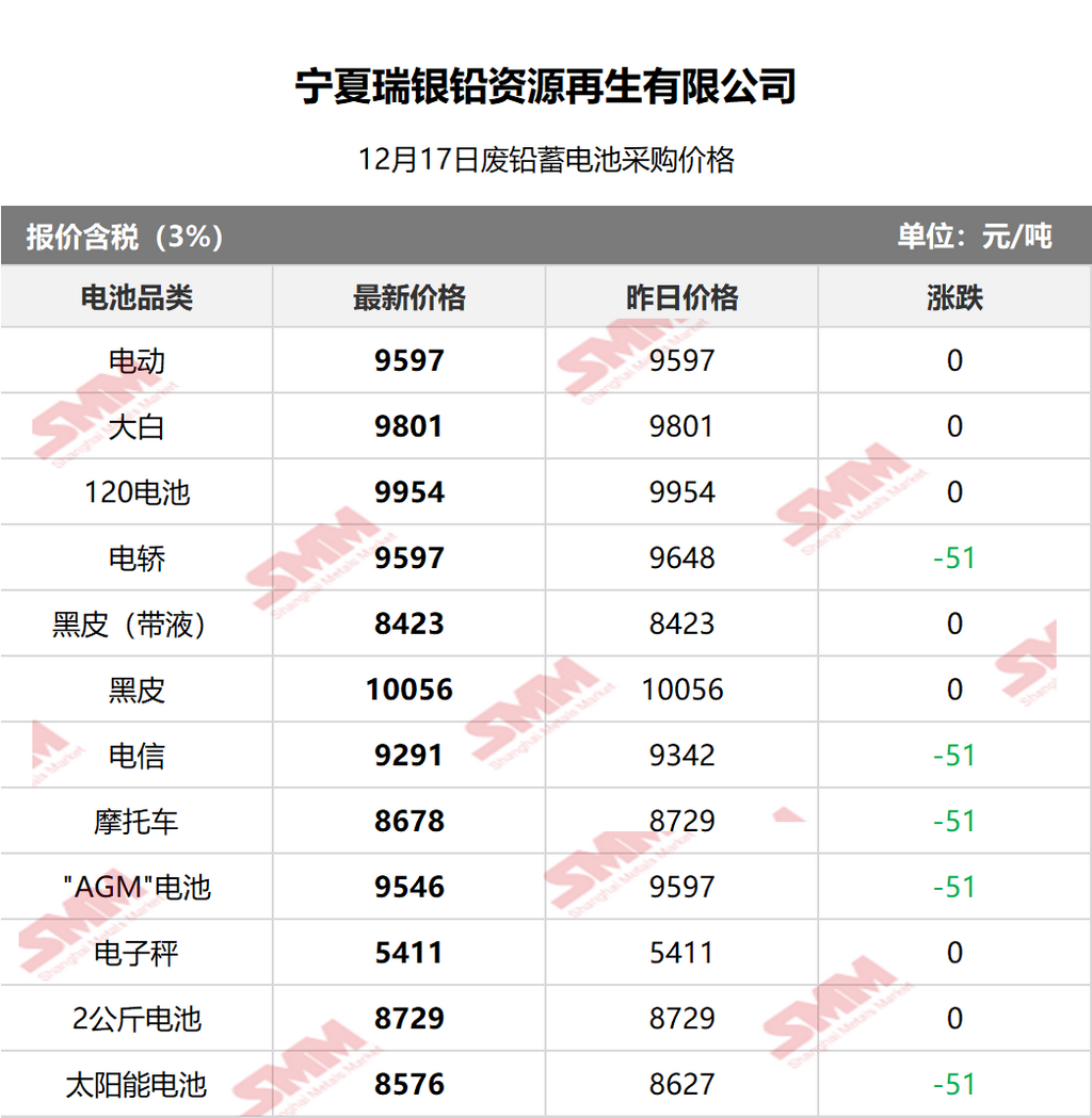 SMM 2025/12/17 国内知名再生铅企业废电瓶采购报价