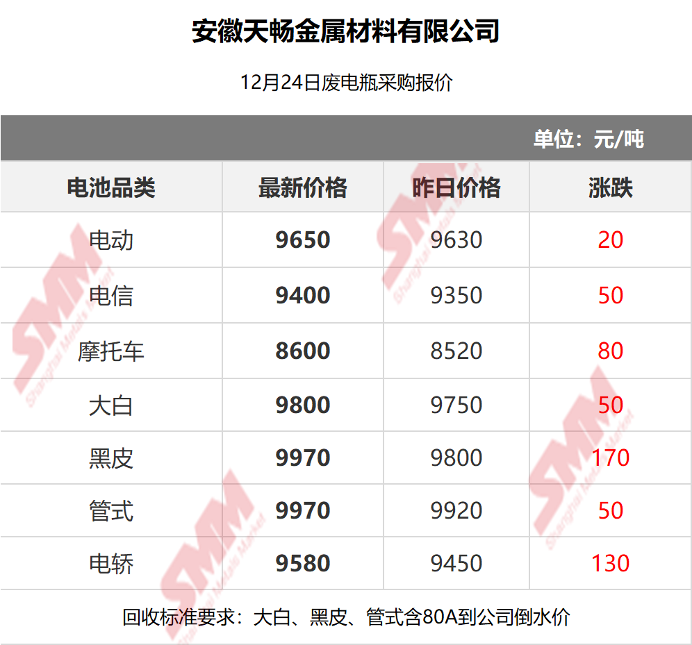 SMM 2025/12/24 国内知名再生铅企业废电瓶采购报价