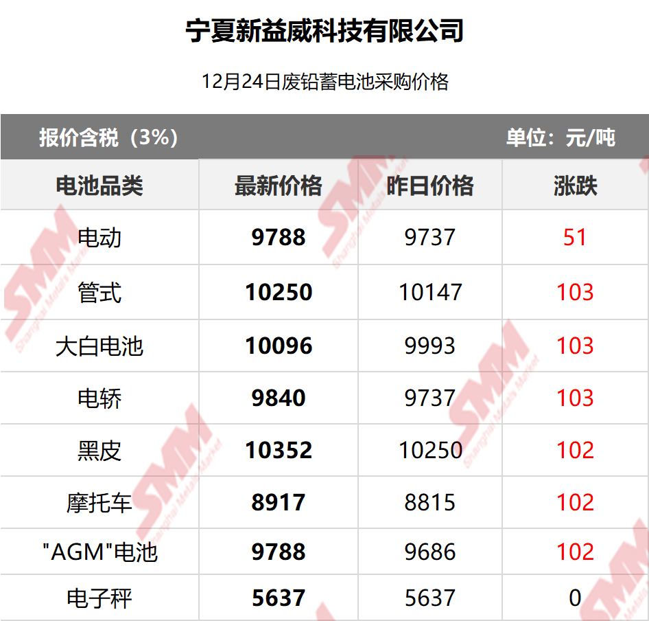 SMM 2025/12/24 国内知名再生铅企业废电瓶采购报价
