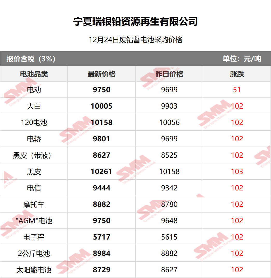 SMM 2025/12/24 国内知名再生铅企业废电瓶采购报价