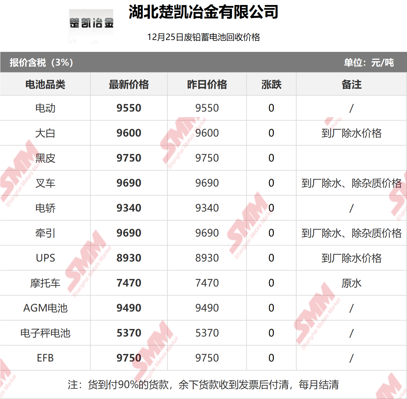 SMM 2025/12/25 国内知名再生铅企业废电瓶采购报价