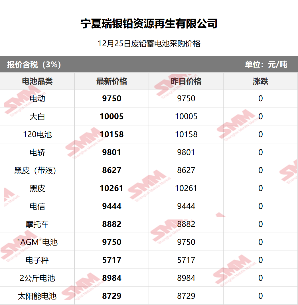SMM 2025/12/25 国内知名再生铅企业废电瓶采购报价