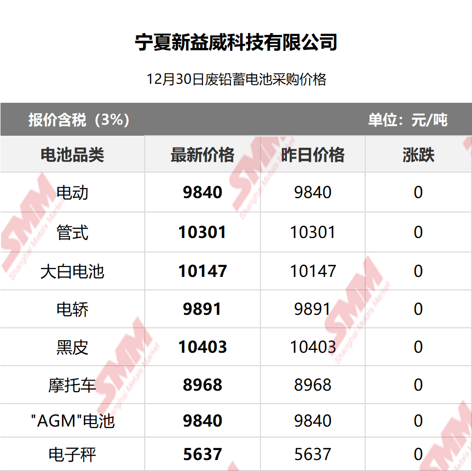SMM 2025/12/30 国内知名再生铅企业废电瓶采购报价