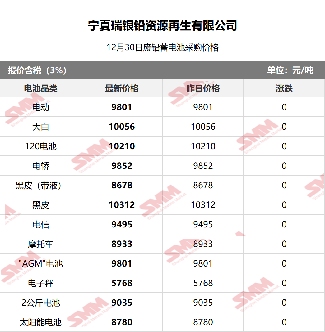 SMM 2025/12/30 国内知名再生铅企业废电瓶采购报价