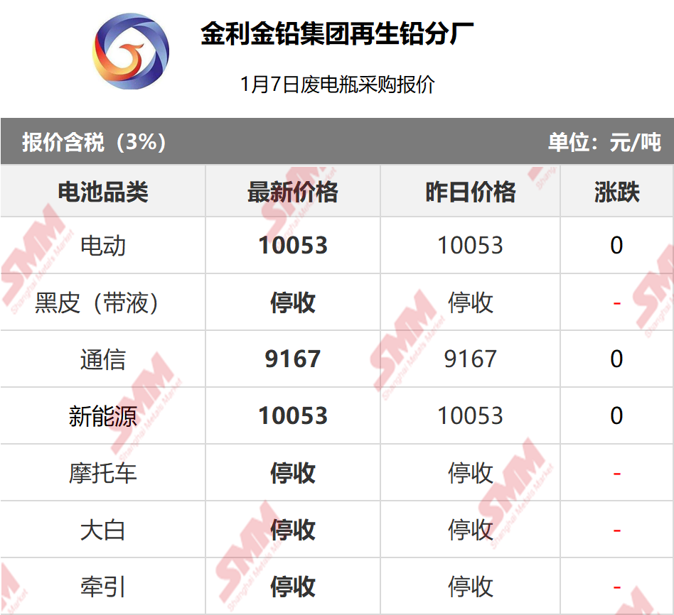 SMM 2026/1/7 国内知名再生铅企业废电瓶采购报价