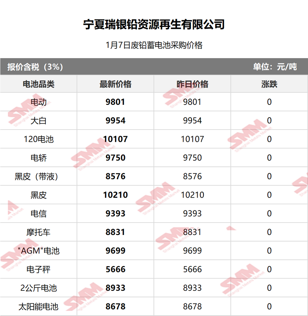 SMM 2026/1/7 国内知名再生铅企业废电瓶采购报价