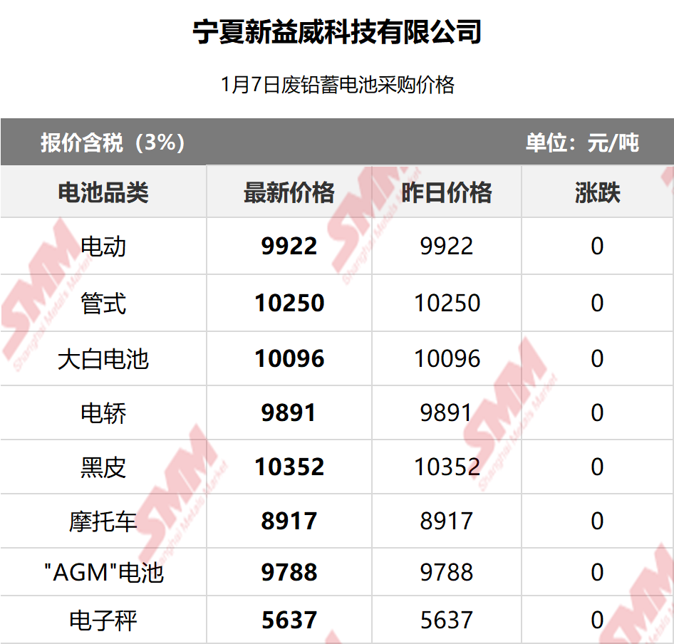 SMM 2026/1/7 国内知名再生铅企业废电瓶采购报价