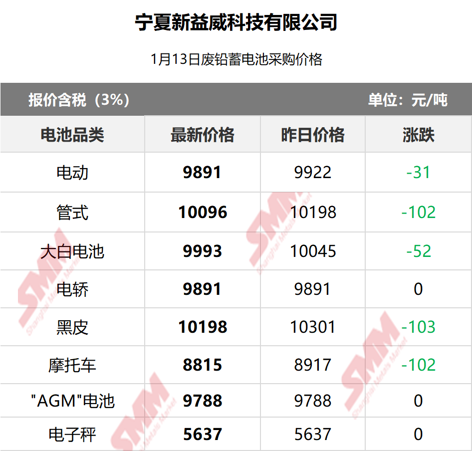 1月13日宁夏新益威 废电瓶采购报价