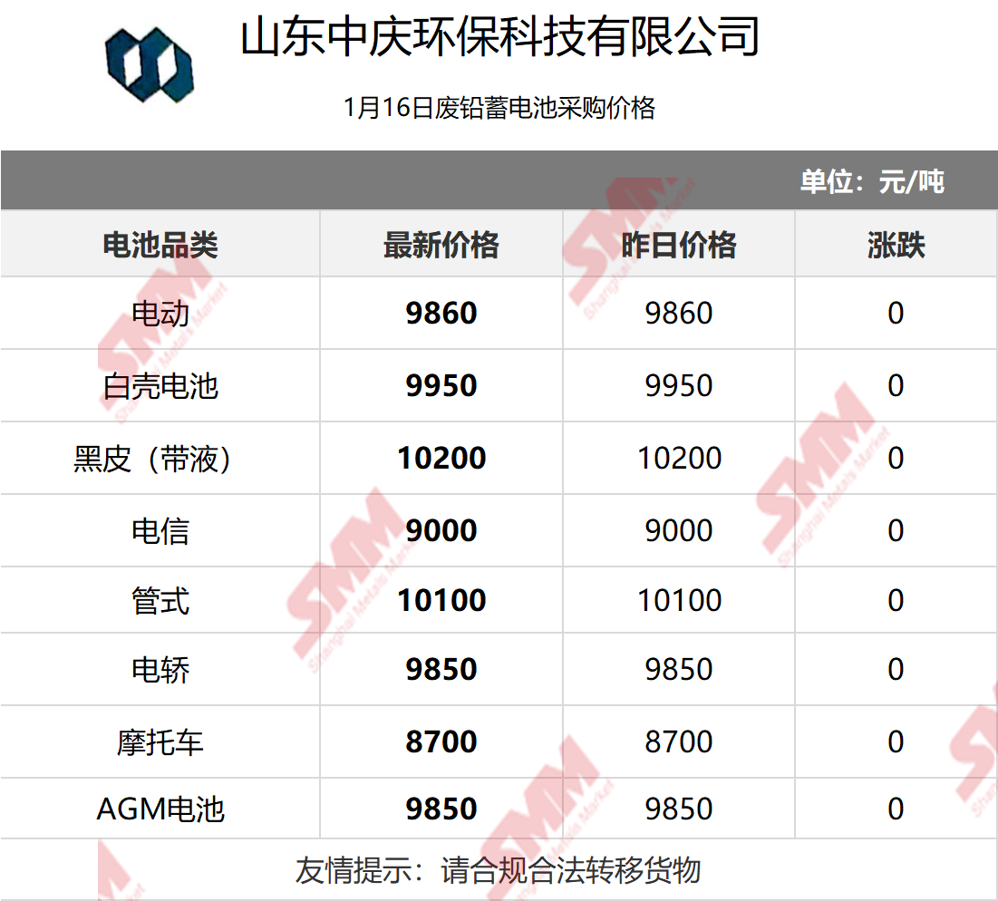 1月16日山东中庆 废电瓶采购报价