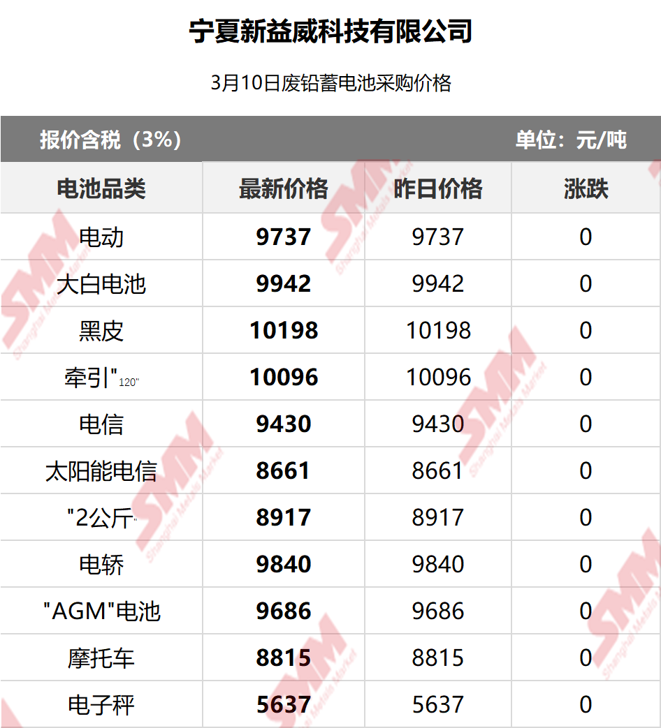 SMM 2026/3/10 国内知名再生铅企业废电瓶采购报价