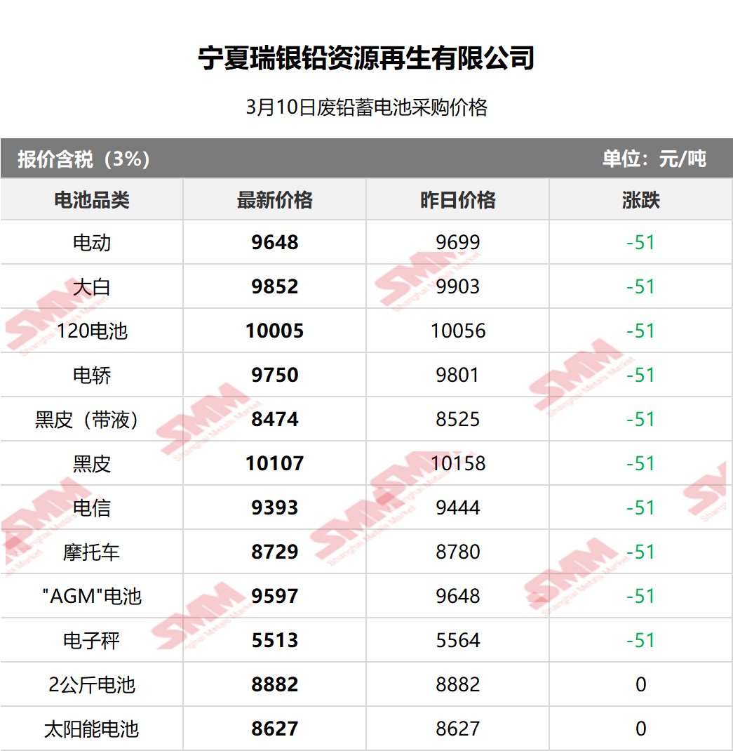 SMM 2026/3/10 国内知名再生铅企业废电瓶采购报价