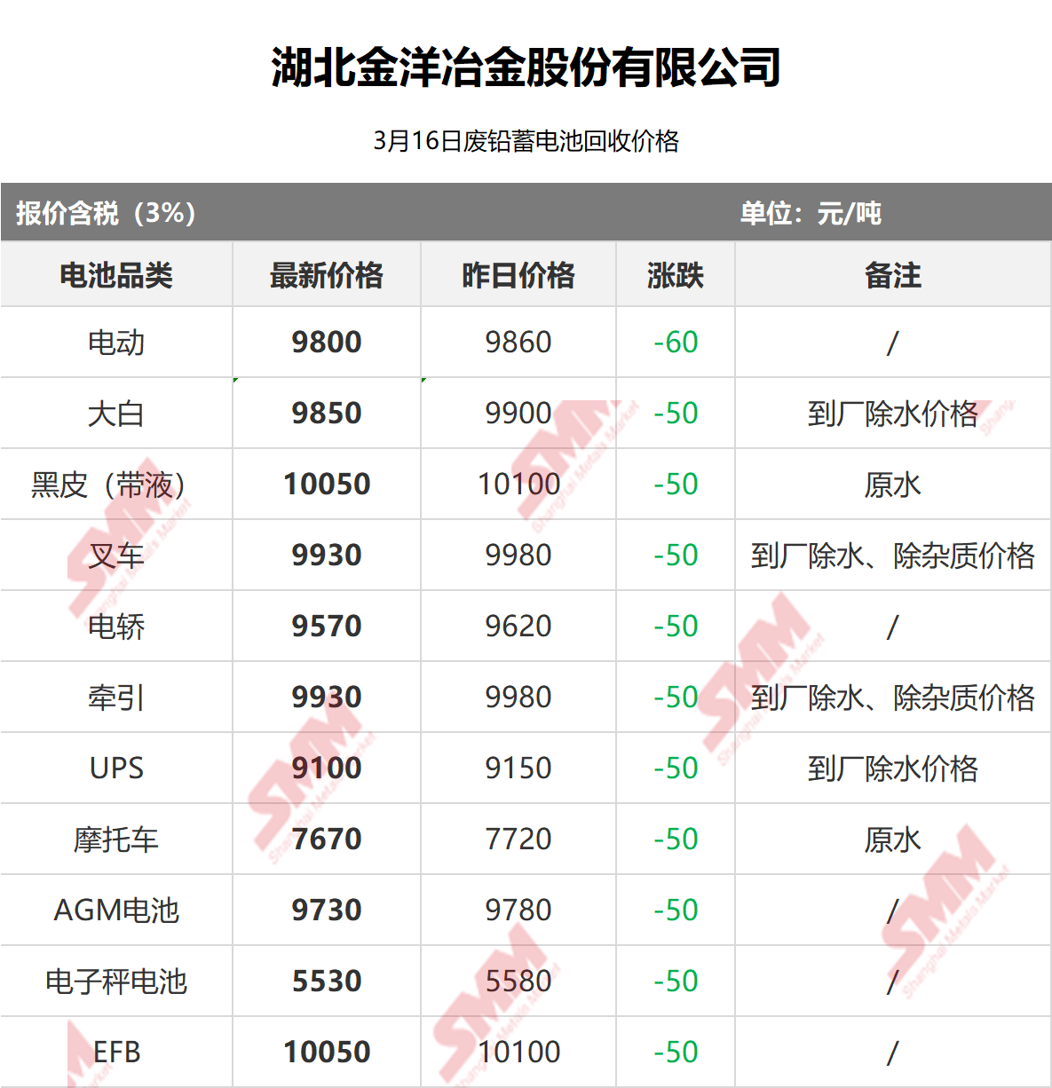 SMM 2026/3/17 国内知名再生铅企业废电瓶采购报价